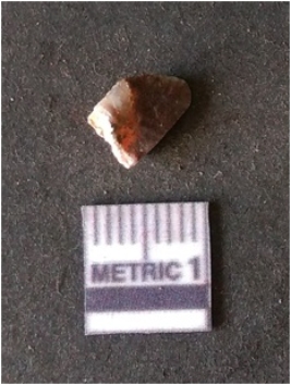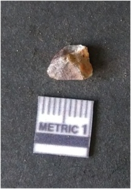 | Description / विवरण | The jasper fragment has sharp flaked edges and a bulb of percussion. The piece is dark in color and has crypto crystalline matrix. |