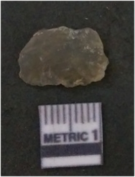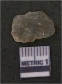 | Description / विवरण | The flake has irregular fracture pattern and sharp flaked edges as a result of lithic knapping activity. The piece is pale, with surfacial flake scars and a bulbous end. The flake is of smoky quartz variety, grayish in colour and translucent in appearance. |