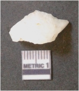 | Description / विवरण | The quartz flake has sharp flaked edges and pointed ends as a result of flaking. The piece is semi-transparent in nature with irregular fracture pattern. The piece is roughly triangular in shape and has a prominent bulb of percussion. |