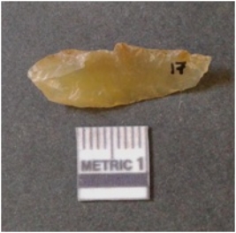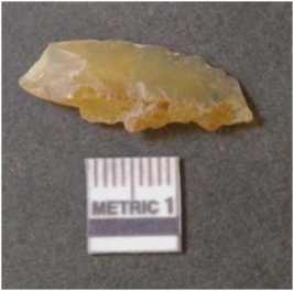 | Description / विवरण | It is chalcedony flake, translucent in appearance. The piece shows sharp pointed ends and flake scars on the surface as a result of flaking. The piece shows a bulb of percussion. |