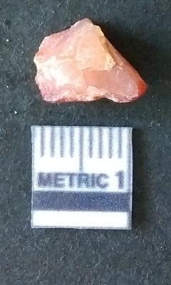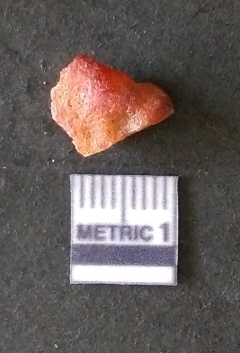 | Description / विवरण | The carnelian flake is reddish in color, with sharp flakes edges and a small bulb of percussion owing to knapping activity. |