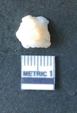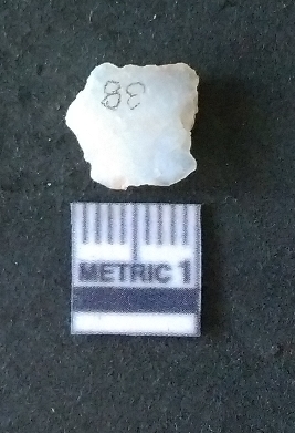 | Description / विवरण | The milky quartz piece is white in color, with angular flaked edges and a bulb of percussion. The piece has a crypto crystalline matrix. |