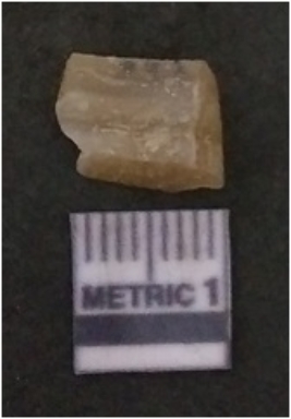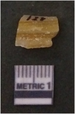 | Description / विवरण | The banded agate piece is crystalline in nature, with a smooth fracture pattern and visible bands on the flaked sides. The piece is pale in color and has sharp flaked ends. |