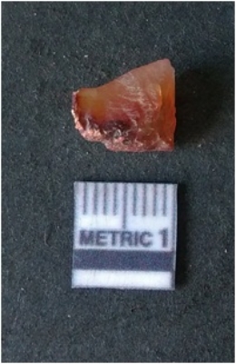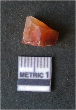 | Description / विवरण | It is carnelian flake, with sharp flakes edges and a small bulb of percussion owing to knapping activity. |