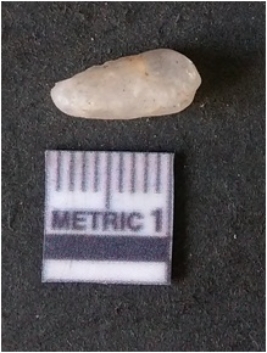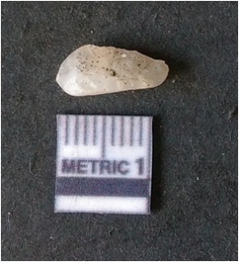 | Description / विवरण | The quartz fragment shows prominent flaks scars and sharp flaked ends as a result of flaking. The piece is translucent white and shows cryptocrystalline matrix. |