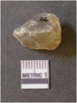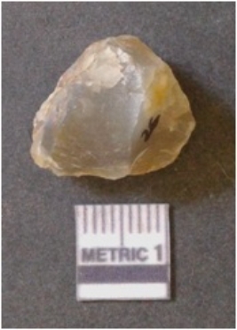 | Description / विवरण | It is chalcedony flake, translucent in appearance. The piece shows sharp pointed ends and flake scars on the surface as a result of flaking. The piece shows a bulb of percussion. |