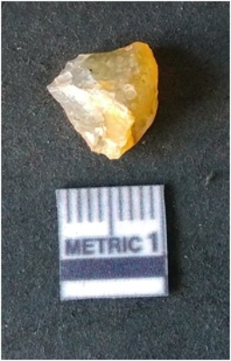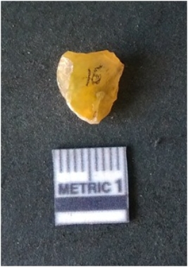 | Description / विवरण | It is chalcedony flake. Translucent in appurtenance. The piece is shows sharp pointed ends and flake scars on the surface. As a result of flaking. |