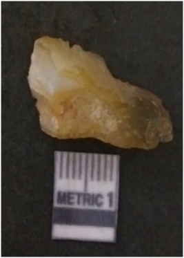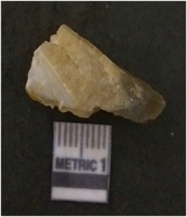 | Description / विवरण | The banded agate piece is crystalline in nature, with a smooth fracture pattern and visible bands on the flaked sides. The piece is pale in color and has sharp flaked ends. |