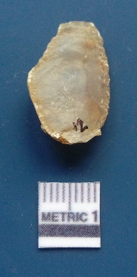 | Description / विवरण | It is chalcedony flake, translucent in appearance. The piece shows sharp pointed ends and flake scars on the surface as a result of flaking. The piece shows a bulb of percussion. |