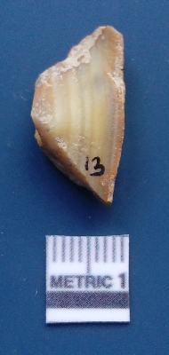 | Description / विवरण | It is chalcedony flake, translucent in appearance. The piece shows sharp pointed ends and flake scars on the surface as a result of flaking. The piece shows a bulb of percussion. |