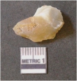 | Description / विवरण | The quartz flake has sharp flaked edges and pointed ends as a result of flaking. The piece is semi-transparent in nature with irregular fracture pattern. The piece is roughly triangular in shape and has a prominent bulb of percussion. |