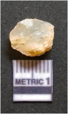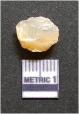 | Description / विवरण | It is chalcedony flake, translucent in appearance. The piece shows sharp pointed ends and flake scars on the surface as a result of flaking. The piece shows a bulb of percussion. |