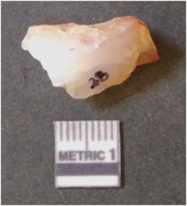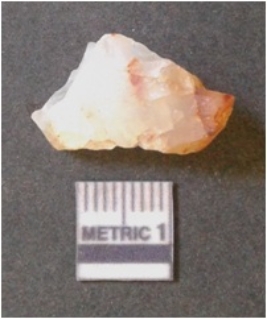 | Description / विवरण | The quartz flake has sharp flaked edges and pointed ends as a result of flaking. The piece is semi-transparent in nature with irregular fracture pattern. The piece is roughly triangular in shape and has a prominent bulb of percussion. |