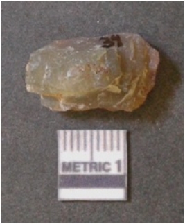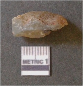 | Description / विवरण | It is chalcedony flake, translucent in appearance. The piece shows sharp pointed ends and flake scars on the surface as a result of flaking. The piece shows a bulb of percussion. |