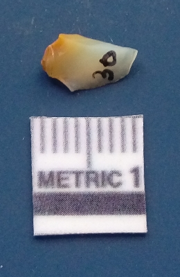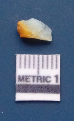 | Description / विवरण | It is chalcedony flake, translucent in appearance. The piece shows sharp pointed ends and flake scars on the surface as a result of flaking. The piece shows a bulb of percussion. |