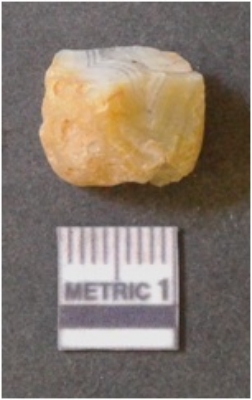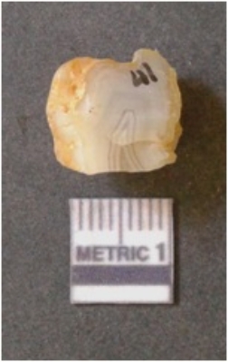 | Description / विवरण | The banded agate piece is crystalline in nature, with a smooth fracture pattern and visible bands on the flaked sides. The piece is pale in color and has sharp flaked ends. |