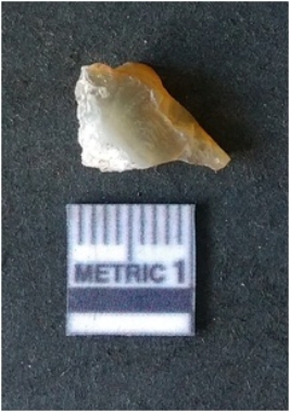 | Description / विवरण | It is chalcedony flake. Translucent in appurtenance. The piece is shows sharp pointed ends and flake scars on the surface. As a result of flaking. |