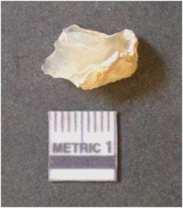 | Description / विवरण | It is chalcedony flake, translucent in appearance. The piece shows sharp pointed ends and flake scars on the surface as a result of flaking. The piece shows a bulb of percussion. |