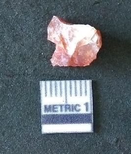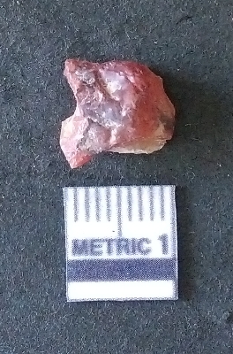 | Description / विवरण | The carnelian flake is reddish in color, with sharp flakes edges and a small bulb of percussion owing to knapping activity. |