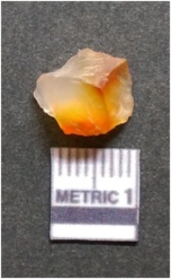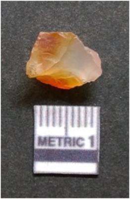| Description / विवरण | It is chalcedony flake, translucent in appearance. The piece shows sharp pointed ends and flake scars on the surface as a result of flaking. The piece shows a bulb of percussion. |
