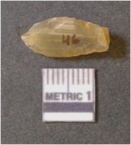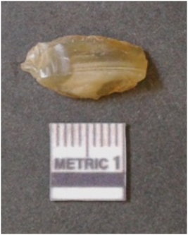 | Description / विवरण | It is chalcedony flake, translucent in appearance. The piece shows sharp pointed ends and flake scars on the surface as a result of flaking. The piece shows a bulb of percussion. |