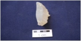 | Description / विवरण | Flake, made on Agate, byproduct of tool manufacturing, narrow platform, encrusted with gray colour deposit, ridge on one side. |