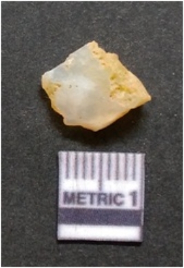 | Description / विवरण | It is chalcedony flake, translucent in appearance. The piece shows sharp pointed ends and flake scars on the surface as a result of flaking. The piece shows a bulb of percussion. |