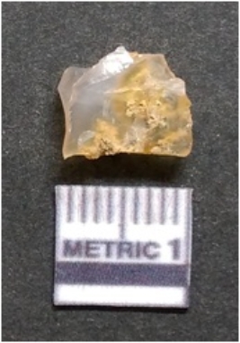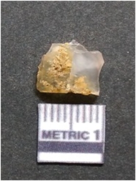 | Description / विवरण | It is chalcedony flake, translucent in appearance. The piece shows sharp pointed ends and flake scars on the surface as a result of flaking. The piece shows a bulb of percussion. |