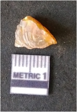 | Description / विवरण | It is chalcedony flake. Translucent in appurtenance. The piece is shows sharp pointed ends and flake scars on the surface. As a result of flaking. |
