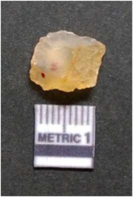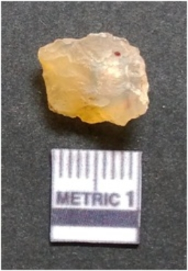 | Description / विवरण | It is chalcedony flake, translucent in appearance. The piece shows sharp pointed ends and flake scars on the surface as a result of flaking. The piece shows a bulb of percussion. |