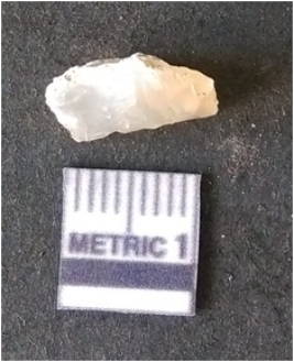 | Description / विवरण | The quartz fragment shows prominent flaks scars and sharp flaked ends as a result of flaking. The piece is translucent white and shows cryptocrystalline matrix. |