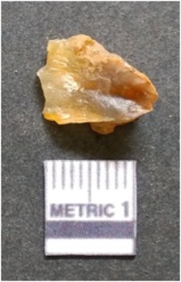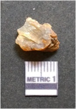 | Description / विवरण | It is chalcedony flake, translucent in appearance. The piece shows sharp pointed ends and flake scars on the surface as a result of flaking. The piece shows a bulb of percussion. |