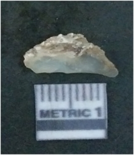 | Description / विवरण | It is chalcedony flake, translucent in appearance. The piece shows sharp pointed ends and flake scars on the surface as a result of flaking. The piece shows a bulb of percussion. |