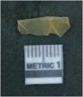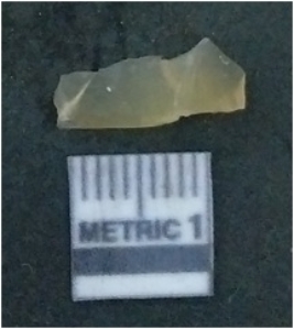 | Description / विवरण | It is chalcedony flake, translucent in appearance. The piece shows sharp pointed ends and flake scars on the surface as a result of flaking. The piece shows a bulb of percussion. |