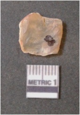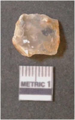 | Description / विवरण | The quartz flake has sharp flaked edges and pointed ends as a result of flaking. The piece is semi-transparent in nature with irregular fracture pattern. The piece is roughly triangular in shape and has a prominent bulb of percussion. |