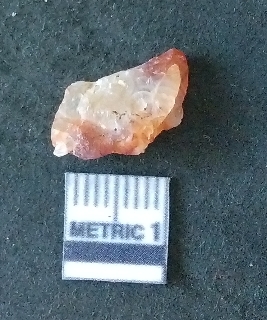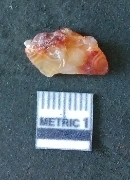 | Description / विवरण | The carnelian flake is reddish in color, with sharp flakes edges and a small bulb of percussion owing to knapping activity. |
