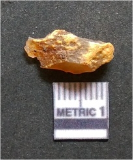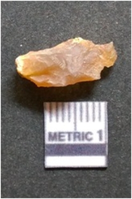 | Description / विवरण | It is chalcedony flake, translucent in appearance. The piece shows sharp pointed ends and flake scars on the surface as a result of flaking. The piece shows a bulb of percussion. |