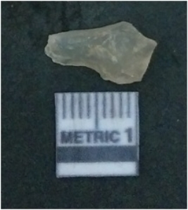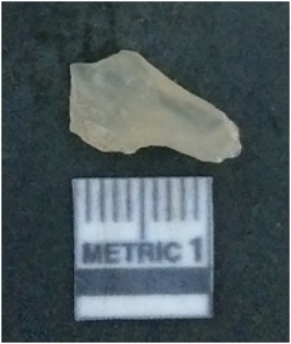 | Description / विवरण | It is chalcedony flake, translucent in appearance. The piece shows sharp pointed ends and flake scars on the surface as a result of flaking. The piece shows a bulb of percussion. |