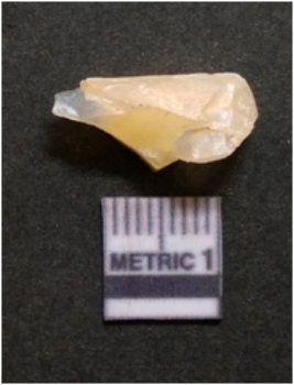 | Description / विवरण | It is chalcedony flake, translucent in appearance. The piece shows sharp pointed ends and flake scars on the surface as a result of flaking. The piece shows a bulb of percussion. |