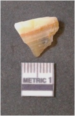 | Description / विवरण | The banded agate piece is crystalline in nature, with a smooth fracture pattern and visible bands on the flaked sides. The piece is pale in color and has sharp flaked ends. |
