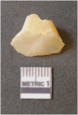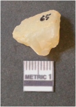 | Description / विवरण | The quartz flake has sharp flaked edges and pointed ends as a result of flaking. The piece is semi-transparent in nature with irregular fracture pattern. The piece is roughly triangular in shape and has a prominent bulb of percussion. |