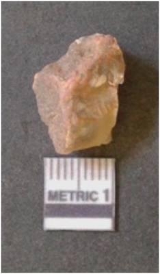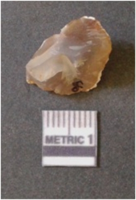 | Description / विवरण | It is chalcedony flake, translucent in appearance. The piece shows sharp pointed ends and flake scars on the surface as a result of flaking. The piece shows a bulb of percussion. |