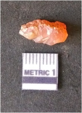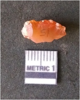 | Description / विवरण | It is carnelian flake, with sharp flakes edges and a small bulb of percussion owing to knapping activity. |