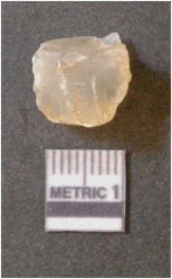 | Description / विवरण | The quartz flake has sharp flaked edges and pointed ends as a result of flaking. The piece is semi-transparent in nature with irregular fracture pattern. The piece is roughly triangular in shape and has a prominent bulb of percussion. |