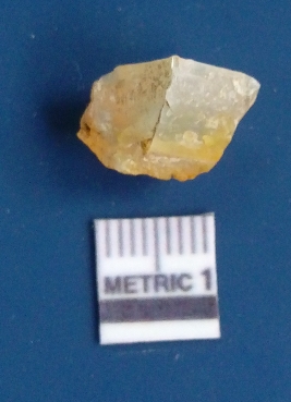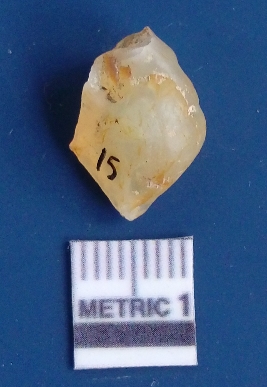 | Description / विवरण | It is chalcedony flake, translucent in appearance. The piece shows sharp pointed ends and flake scars on the surface as a result of flaking. The piece shows a bulb of percussion. |