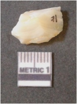 | Description / विवरण | The quartz flake has sharp flaked edges and pointed ends as a result of flaking. The piece is semi-transparent in nature with irregular fracture pattern. The piece is roughly triangular in shape and has a prominent bulb of percussion. |
