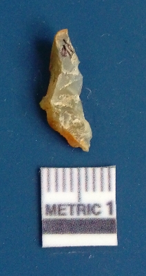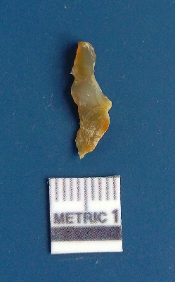 | Description / विवरण | It is chalcedony flake, translucent in appearance. The piece shows sharp pointed ends and flake scars on the surface as a result of flaking. The piece shows a bulb of percussion. |