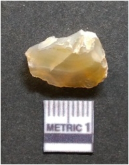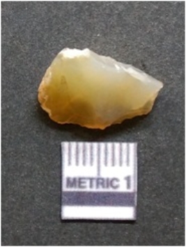 | Description / विवरण | It is chalcedony flake, translucent in appearance. The piece shows sharp pointed ends and flake scars on the surface as a result of flaking. The piece shows a bulb of percussion. |