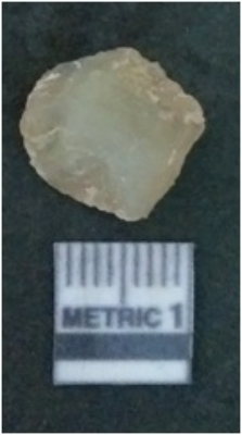 | Description / विवरण | It is chalcedony flake, translucent in appearance. The piece shows sharp pointed ends and flake scars on the surface as a result of flaking. The piece shows a bulb of percussion. |