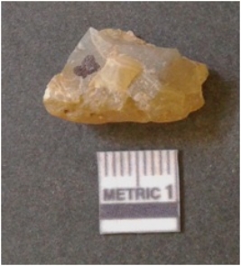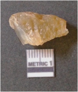 | Description / विवरण | The agate piece is translucent in appurtenance, with angular flaked edges and a bulb of percussion. The piece shows flake scars on the surface. |